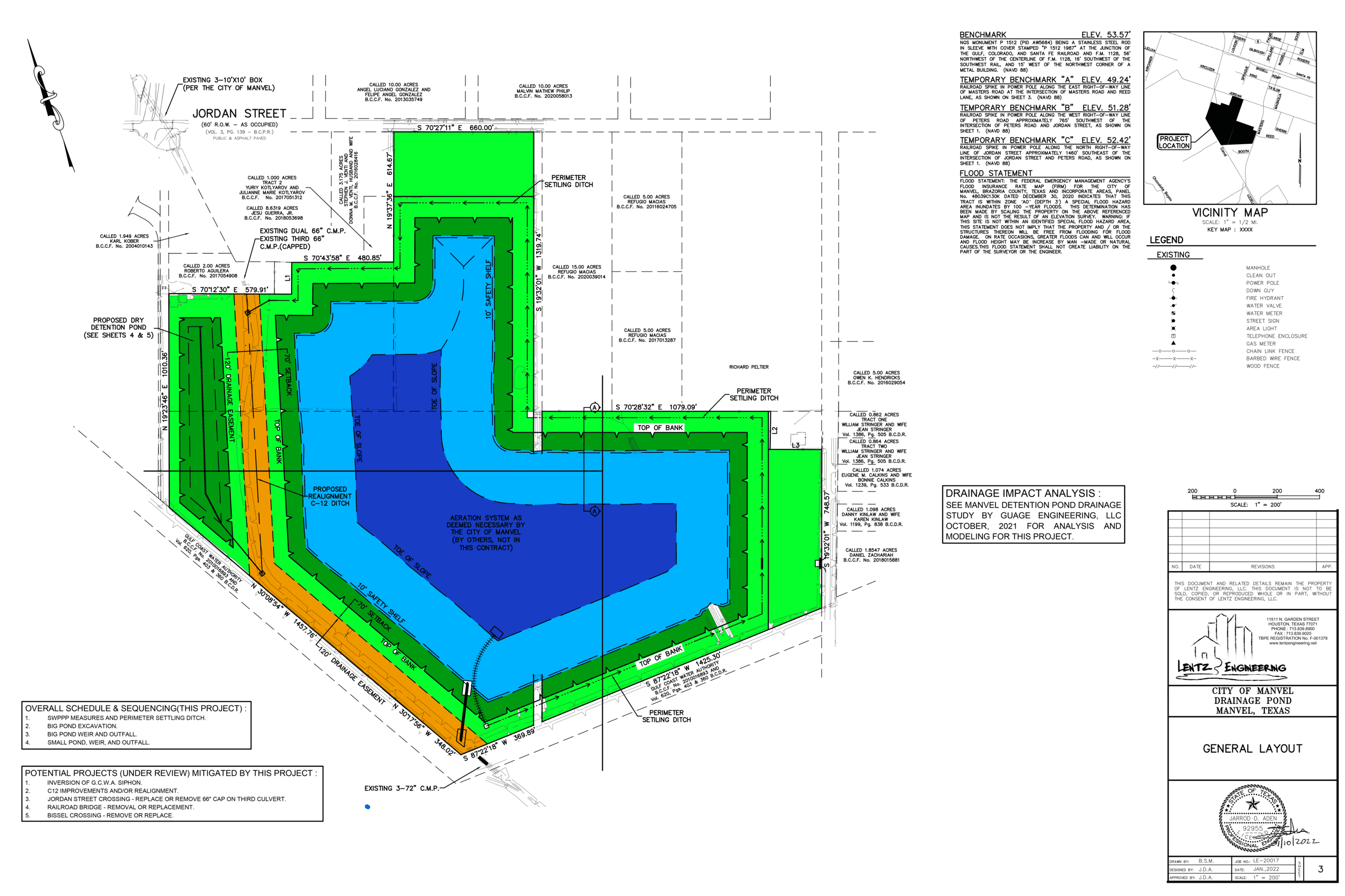 A drainage pond, or "detention pond," is a constructed depression that receives and stores stormwater runoff from a specific drainage area. Akery Lake will provide many benefits to the City, including the reduction of ponding water on SH6, a designated evacuation route, during extreme flooding events.